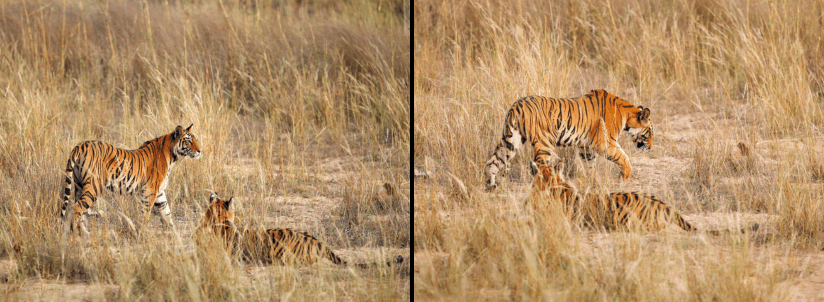 These two sub adult cubs (ID: Rajbhera Cubs), aged around 21 months are engaged in a mock fight, a part of their learning process to acquire stalking and self-defense skills. In this series you see the tigers are seen resting when something grabs the attention of one of them.