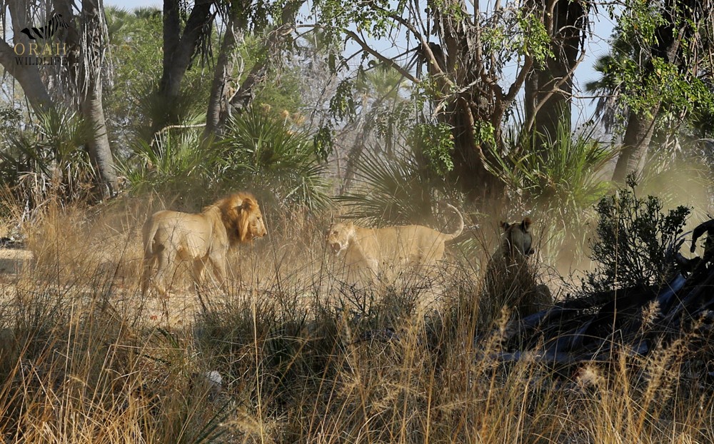 I came across this lioness that was dragging its kill of a wildebeest calf down to the shade. I followed her, keeping my distance from her. She dragged it to a palm bush where she was joined by another lioness and four really tiny cubs. It was a fantastic experience, as I had never before seen such tiny cubs. The lioness were looking exhausted after making the kill in such heat and were seemingly relaxing, taking a nap and playing with the cubs.